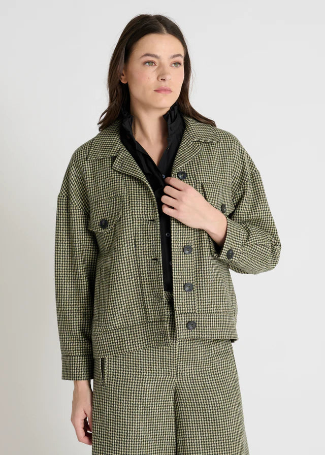 Confectionné dans une matière tailleur fantaisie kaki à motif pied-de-poule, ce blouson à la coupe structurée se distingue par ses dix boutons en corne répartis sur le col, les poches et les poignets, apportant un jeu graphique et raffiné.